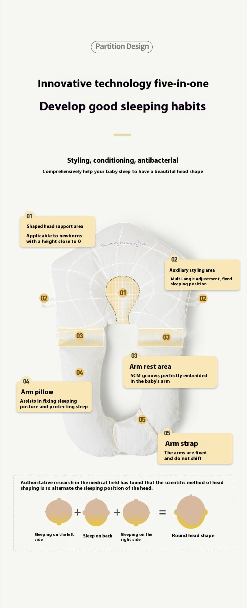 Worried about flat head syndrome? Our pillow is designed with a special "Correct Sleeping Position" feature. The pillow base is adjustable with drawstrings, allowing you to create the perfect head shape. The rounded groove support gently cradles your baby’s head, while the ergonomic design with a "Special arm area" provides a secure, intimate sleep, helping to prevent the startle reflex and encourage deep, peaceful rest.