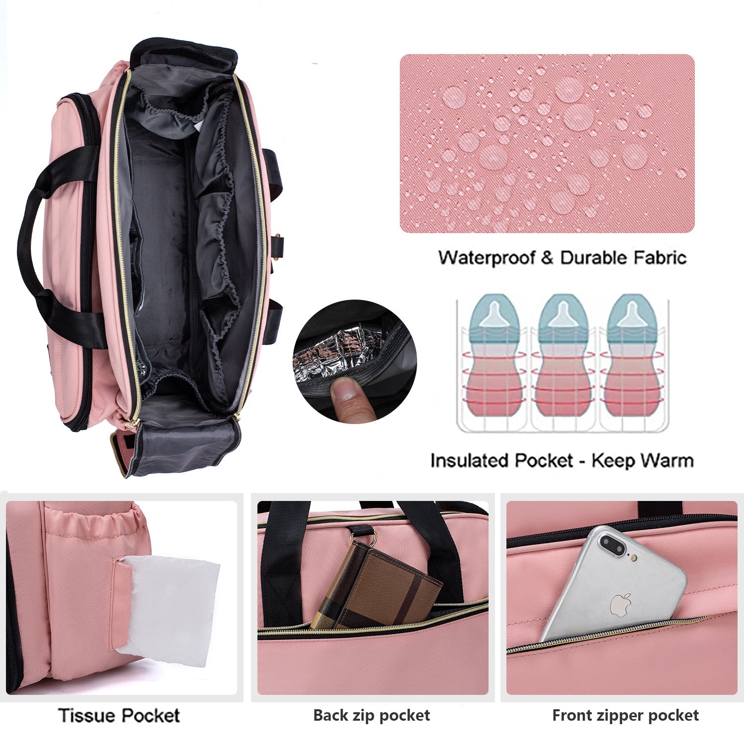 Key Features: Integrated Portable Folding Crib, Multiple Insulated Pockets, Zipper Closures, Ergonomic Straps.